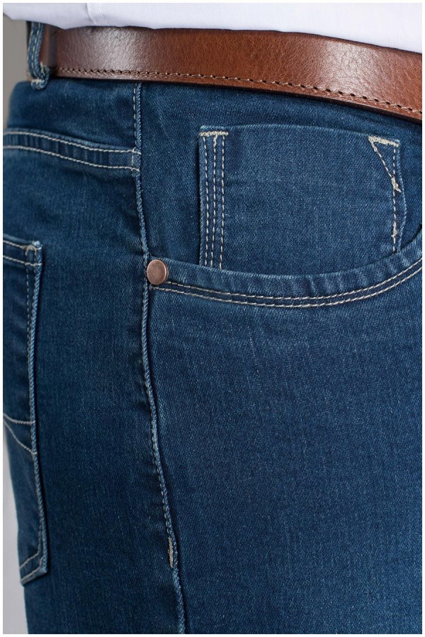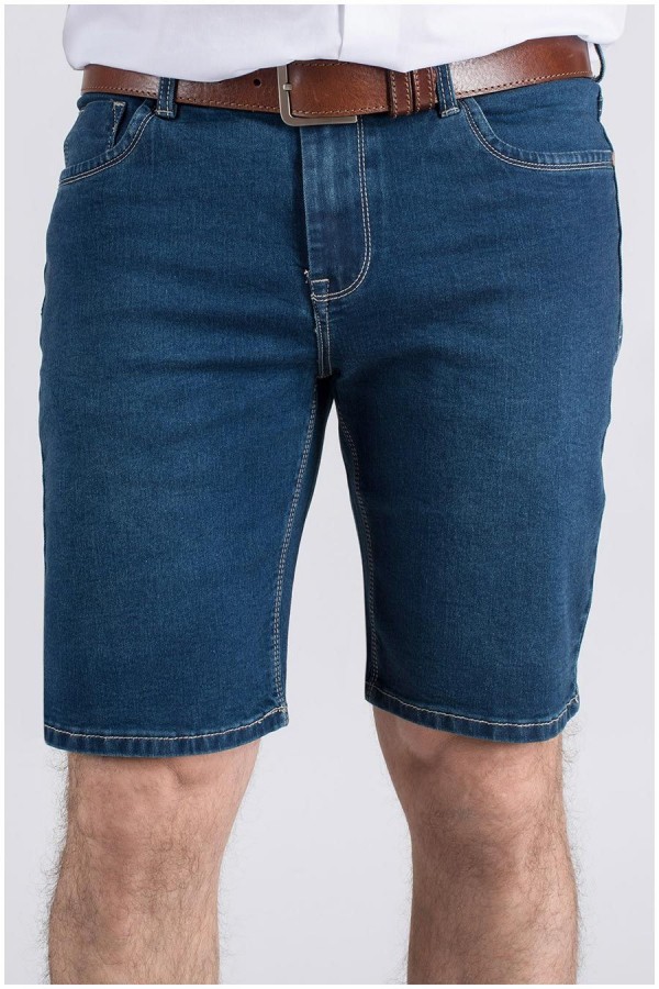 Elastische Denim-Shorts im 5-Pocket-Modell der Marke Plus Man. Diese Jeans Bermuda ist elastisch und angenehm zu tragen, da Elastan in den Denim eingearbeitet ist. Der Bund hat ein Markenzeichen und ein weiteres schönes Detail sind die kontrastfarbigen Nähte.