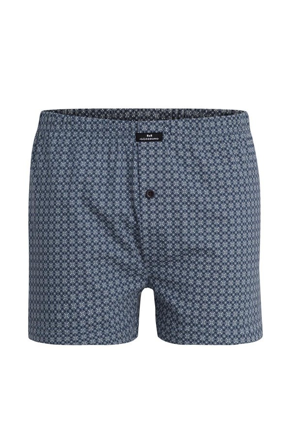 Jersey-Boxer der Marke Götzburg mit kleinem All-Over-Print und mit Eingriff mit Knopf. Diese Unterhose hat ein Markenzeichen vorne am Bund und ist hergestellt aus reine Baumwolle.