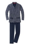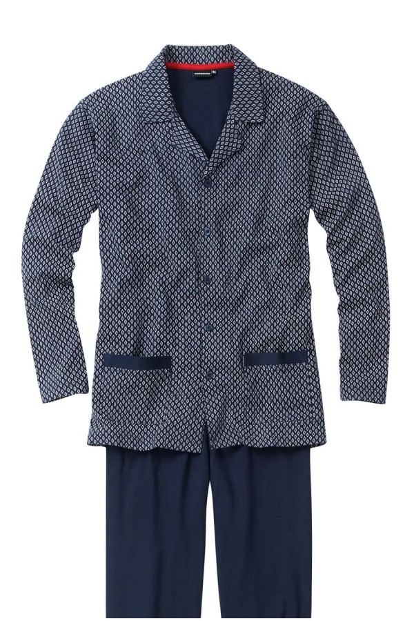Klassischer Pyjama, mit langen Ärmeln und langen Hosenbeinen, mit aufgedrucktem Motiv von Götzburg. Dieser Pyjama aus „reiner Baumwolle“ wird mit Knöpfen geschlossen und hat diverse Taschen. Die dazu passende lange Pyjamahose ist einfarbig.