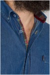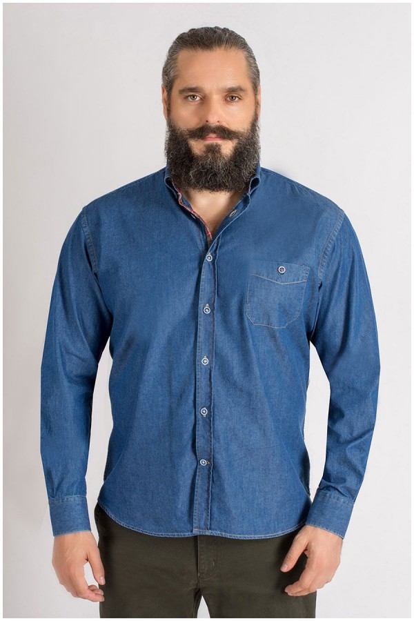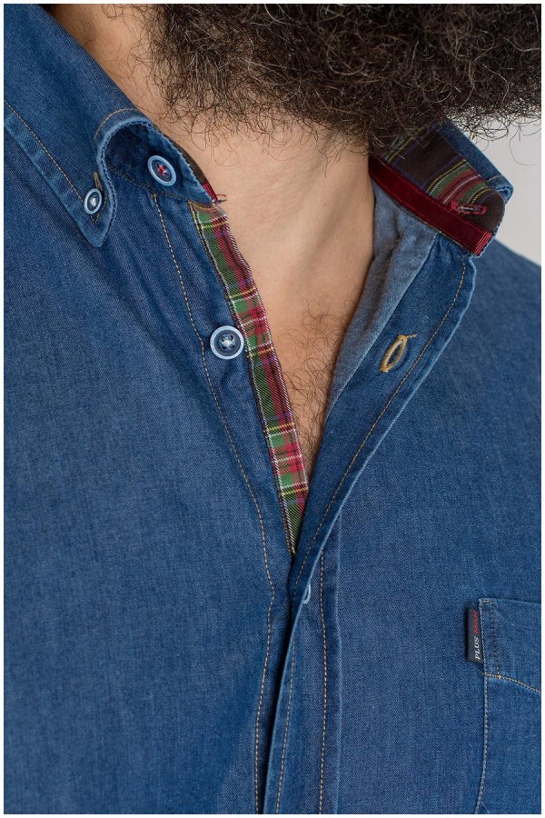 Denim Oberhemd mit langen Ärmeln und Button-down-Kragen von Plus Man. Dieses Hemd wurde in der Produktion stark gewaschen, um einen modernen „Used-Effekt“ zu erzielen. Die Manschetten, die Knopfleiste und der Kragen sind innen mit einem verspielten karierten Stoff abgesetzt. Aus 100 % Baumwolle hergestellt.