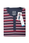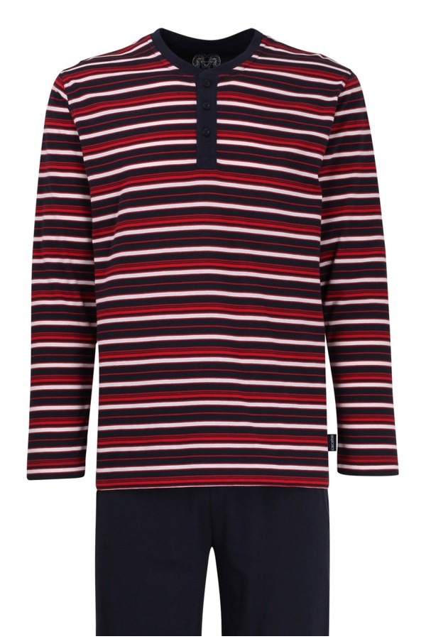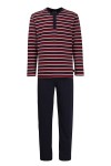 Schlafanzug aus der Klima aktiv Kollektion der Marke Ceceba. Dieses bügelfreie Pyjama-Set (Ceceba Art. Nr. 30946) besteht aus einem langärmeligen Pyjama-Shirt mit Streifenmuster und unifarbigen Pyjamahose. Das Plus Size Herren-Pyjama-Shirt hat einen Serafino-Kragen und einen Markendruck auf der Innenseite des Kragens. Unten links hat das Shirt ein kleines Markenetikett.