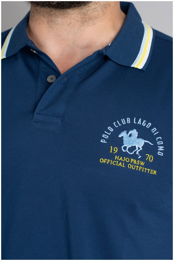 Korte mouw elastische polo van het merk Hajo. Deze grote maten polo is gemaakt van een zeer elastische katoenmix in piqué kwaliteit die geschikt is voor de wasdroger en niet kreukt. De sportieve polo is afgewerkt met contrastbanden langs de kraag en langs de mouwen en is voorzien van een tweekleurig borduur op de borst. De splitjes aan de onderkant zorgen voor extra draagcomfort.