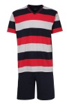 Kurzer Pyjama der Marke Götzburg, bestehend aus uni Shorts mit Elastikbund und einem gestreiften Pyjamahemd mit kurzen Ärmeln. Das Übergrößen-Pyjama-Shirt hat einen V-Ausschnitt. Das Plus Size Shortama besteht aus 100% Baumwolle mit atmungsaktiven und temperaturregulierenden Eigenschaften, wodurch der Pyjama in warmen Nächten luftig und bequem trägt. Darüber hinaus ist die Baumwolle bügelfrei, sodass Sie das Shortama problemlos faltenfrei halten können.