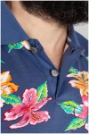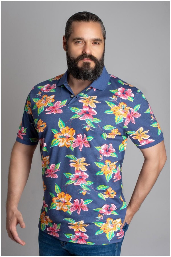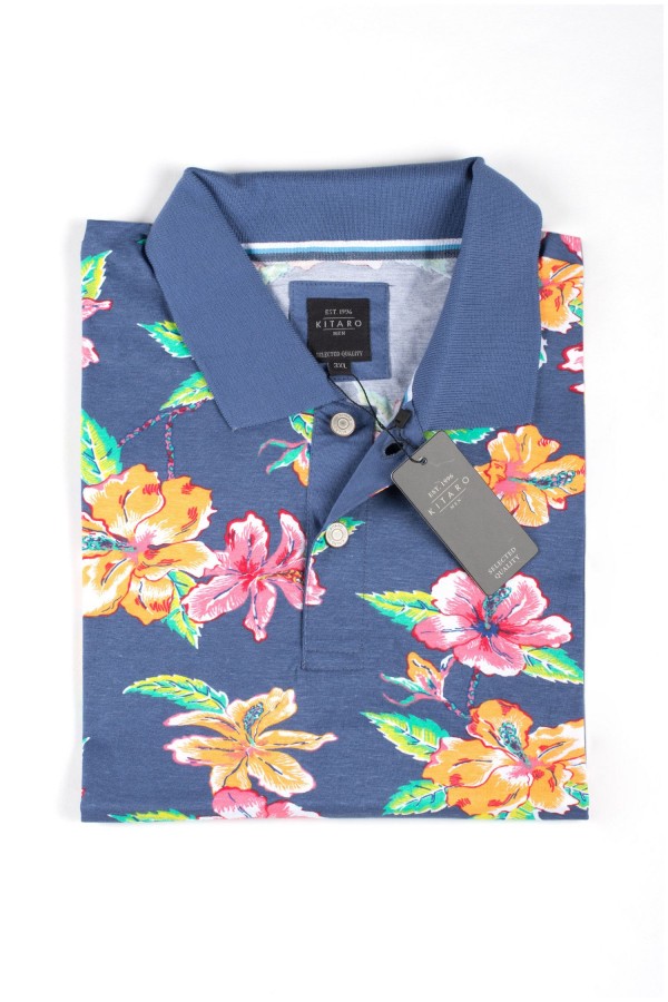 Kurzarm-Poloshirt aus 100% Baumwolle von der Marke Kitaro aus superweichem Single-Jersey. Das Polo ist mit großen, bunten Blumen bedruckt und wirkt daher sehr sommerlich. Der Polokragen hat Metallknöpfe.