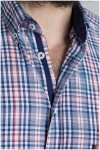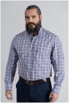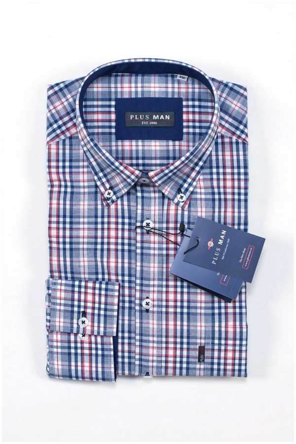 Freizeit-Hemd mit langen Ärmeln und Karomuster von Plusman. Das Hemd hat einen Button-Down-Kragen, der innen mit einem uni Kontraststoff abgesetzt ist. Dieser Kontraststoff ist auch in der Verarbeitung der Knopfleiste verwendet. Das Hemd hat auch eine Brusttasche mit einem kleinen Markenlabel.