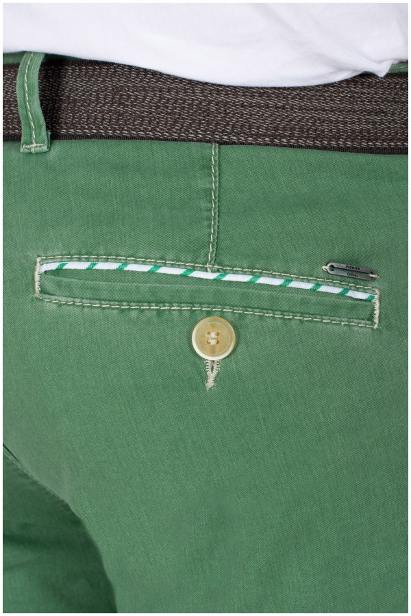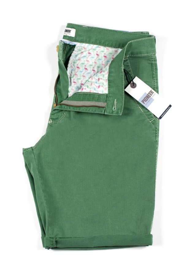 Elastische Shorts der Marke Pionier. Die Bermuda besteht aus einer Mischung aus Baumwolle und Elasthan, wodurch die Shorts elastisch und geschmeidig werden. Es wurde nicht nur an Komfort gedacht, sondern auch an das Aussehen der Shorts während des Designs. Die umgeschlagene Beine und die Kontrastdetails an den Taschen verleihen den xxl Shorts einen modischen Look. Die Gesäßtaschen sind mit einem Knopfverschluss versehen und über der rechten Gesäßtasche ist ein kleines Metallmarkenetikett angebracht. Die Innenseite der Hose hat einen Kontraststoff mit einem Flamingo-Design.