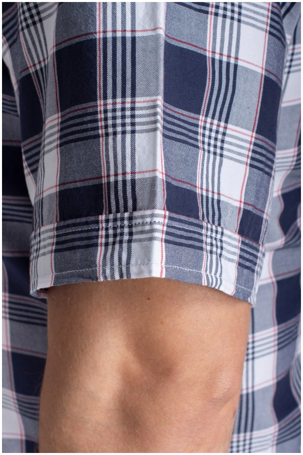 Kurzärmliges kariertes Hemd der Marke Armada. Das Freizeithemd ist mit tonalen Knöpfen und einer aufgesetzten Brusttasche mit Kontraststickerei und Abzeichen versehen. Sowohl der Umschlag der Ärmel als auch die Innenseite des Button-Down-Kragens und die Knopfleiste sind mit einem einfarbigen Chambray-Kontraststoff versehen. Die gefalteten Ärmel verleihen dem Shirt einen stylischen Look. Das Plus Size Herrenhemd besteht aus 100% Baumwolle.
