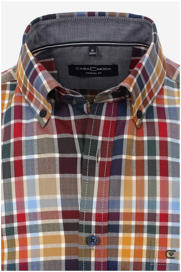 Kariertes Langarm-Freizeithemd der Marke Casamoda. Das Plus-Size-Freizeithemd besteht aus 100% Baumwolle. Auf der Innenseite des Button-Down-Kragens wurde ein Chambray-Kontraststoff verarbeitet. Dies gilt auch für die Manschetten, die ebenfalls mit zwei Manschettenknöpfen versehen sind, mit denen die Größe nach Wunsch angepasst werden kann. Das Plus Size Shirt ist mit tonalen Knöpfen und einer Brusttasche auf der linken Seite versehen.