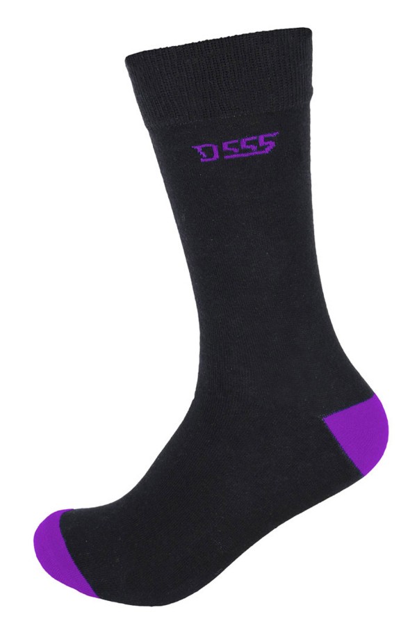 Set mit 3 Paar einfarbigen Baumwollsocken der Marke D555 (PHOENIX KS23112). Diese elastischen Socken bestehen aus einer Kombination aus Baumwolle, Polyester und Elasthan, wodurch diese Socken elastisch, bequem und atmungsaktiv sind und eine perfekte Passform haben. Die Socken sind schwarz, wobei jedes Paar an Ferse, Zehen und dem D555-Logo in Lila, Rot und Blau kontrastiert.