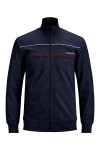 Baumwoll-Strickjacke von Jack & Jones. Kontrastierende Streifen verlaufen bei der Plus Size Jacke über die Brust und verleihen der Strickjacke einen sportlichen Look. Die Baumwolljacke hat ein Markenlogo auf der linken Brust. Die übergrößen Strickjacke hat zwei Seitentaschen.