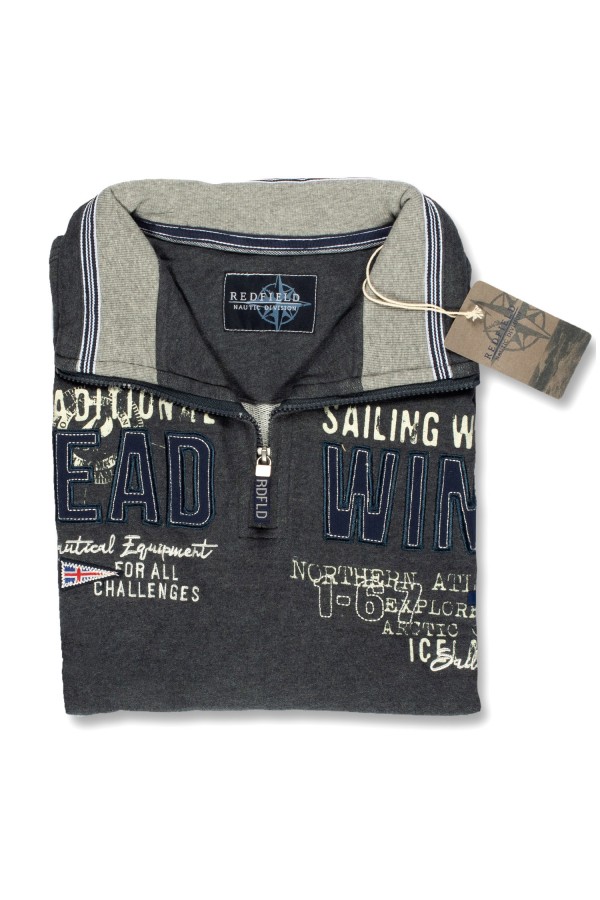 Sweatshirt der Marke Redfield. Der Reißverschlusskragen des Plus Size-Pullovers ist innen mit einem Kontrastband und einem bequemen Rippenstoff versehen. Auf der Brust befinden sich gestickte und gedruckte Buchstaben. Der Textdruck verleiht dem xxl-Pullover einen sportlichen Look. Die Innenseite des Kragens ist mit einem Markenetikett versehen.