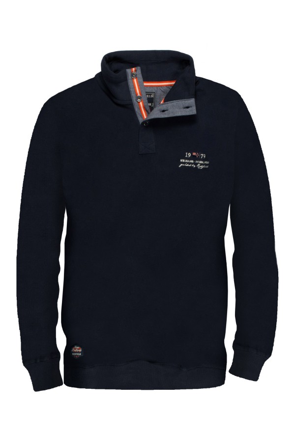 Sweatshirt der Marke Redfield. Der große Pullover ist aus 100% Baumwolle gefertigt und hat eine Stickerei auf der linken Brust. Der Troyer-Kragen ist mit einem Kontraststoff versehen. Die Metallknöpfe am Troyer-Kragen verleihen dem xxl-Sweatshirt einen coolen Look.